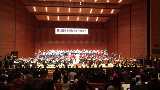 平成30年12月16日(日)に神戸国際会館こくさいホールで開催されました「第50回 兵庫県私学連合音楽会」に、仁川学院と合同で出演しました。定期考査終了後の12月7日から合同練習を開始し、この8日間は授業が終わってからすぐに仁川学院に行かせていただき、練習を積み重ねてきました。本番では、本校の池田先生の指揮で「サンライズマーチ」を、仁川学院の坂本先生の指揮で「ハピネス」をパフォーマンス(振り付け)も含めて演奏させていただきました。会場も一体となって大いに盛り上がりました。また、今年は50回という節目の年ということもあり、演奏会の最後には出演されたオーケストラの演奏に合わせて会場全員で嵐の「ふるさと」を合唱しました。休日にもかかわらず、多くの皆様に聴きに来ていただいたこと、こくさいホールというすばらしいホールで演奏できたこと、仁川学院の皆さんに合同練習の場所を提供していただいたことに感謝致します。ありがとうございました。