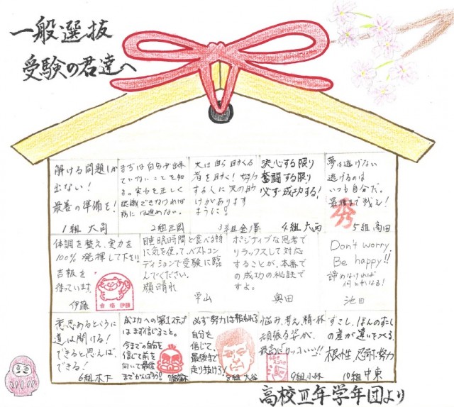 高校Ⅲ年生共通テスト出願150名、16日(月)午前中に真剣な面持ちで自己採点を行いました。今後は校内での出願最終検討会を経て、担任との国公立出願面談がスタートしていきます。画像は高Ⅲ学年団からの寄せ書きと共通テストと一般受験生に贈った激励品です。