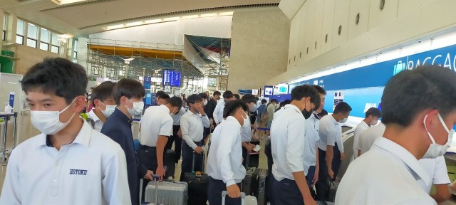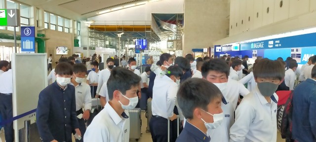 自由行動を満喫し、お土産をいっぱい持って那覇空港に時間厳守で集合しました。定時出発で帰ります。中3学年全員元気です。