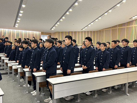 4月9日(火)大谷記念講堂にて1限目に新1年生との対面式、始業式、集会が行われました。対面式では新1年生の入場を新2年生・3年生が温かい拍手で迎えた後、自彊会会長の3年生西田君が歓迎の挨拶をしました。そして、1年生の伊東君が新入生の挨拶をして対面式を終えました。